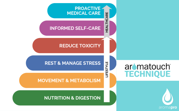 Die AromaTouch Technique passt perfekt in die zweite und dritte Ebene der Pyramide, in der Bewegung, Stoffwechsel, Ruhe und Stressbewältigung im Mittelpunkt stehen. Durch das Massieren unseres Körpers mit den ätherischen Ölen stimulieren wir die Durchblutung und helfen unserem Körper, sich zu entspannen und sich für Heilung zu öffnen.